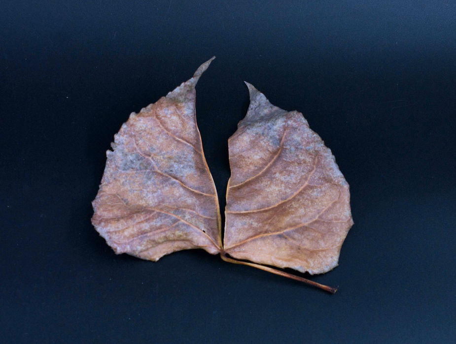 During dehydration, leaves bend and fold according to the structure of their veins. When a leaf dries completely, the connection between its parts limits the bending. Making cuts in the surface allows each area to shape itself according to the vein directions and contraction processes, resulting in new forms.